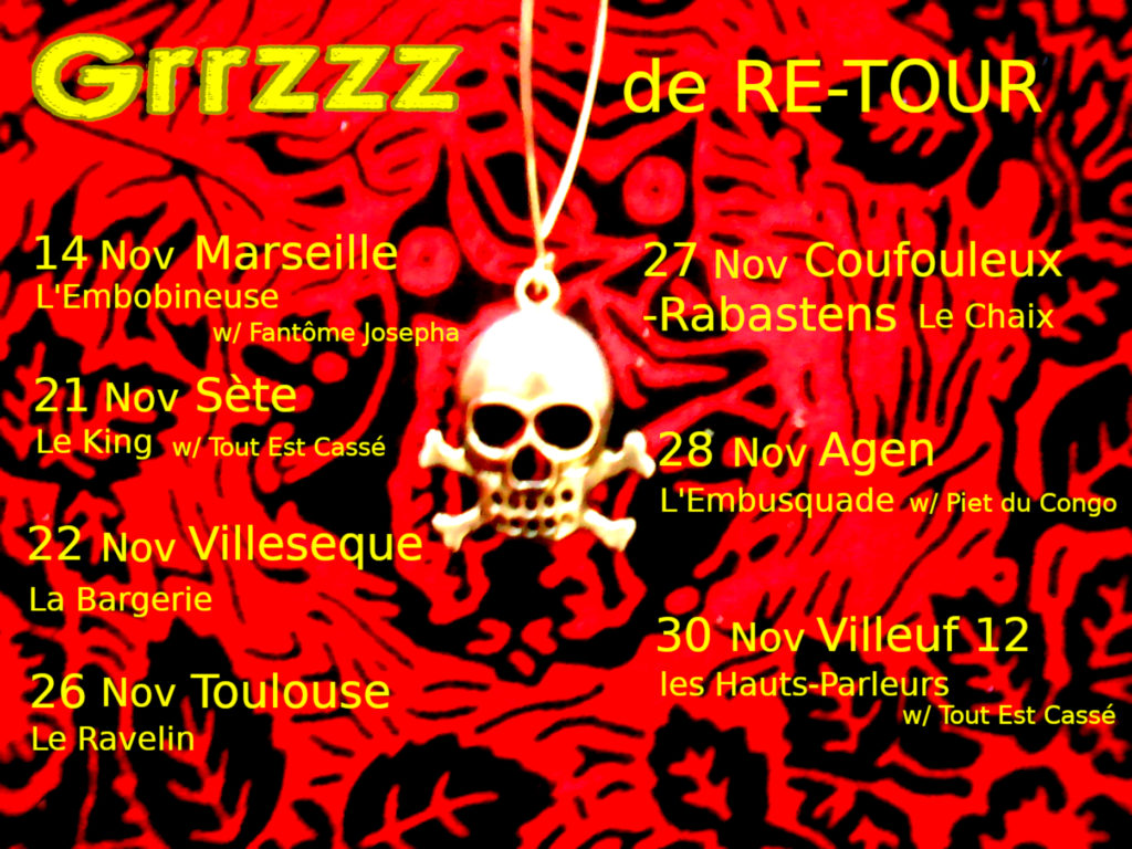 GrRzZz on the road argh! again… GrRzZz de nouveau sur la aaarrgh!… route. Le 10 MAI à la Raymonde à Clermont-Ferrand w/Moineau Écarlate, Purpura & Nur…. Commercial Shit forever!